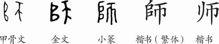“师”是会意字。甲骨文、金文、小篆都从帀(包围),从垖(小土山),用四下里都是小土山会众多的人或物都聚集在一起之意。隶变后楷书写作“師”。汉字简化后写作“师”。
