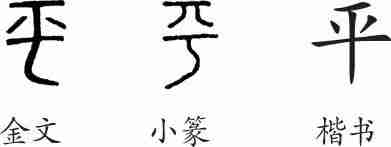 “平”是会意字。金文从亏(于,指气受阻碍而能越过),从八(分),会气越过而能分散,语气自然平和舒顺之意。隶变后楷书写作“平”。