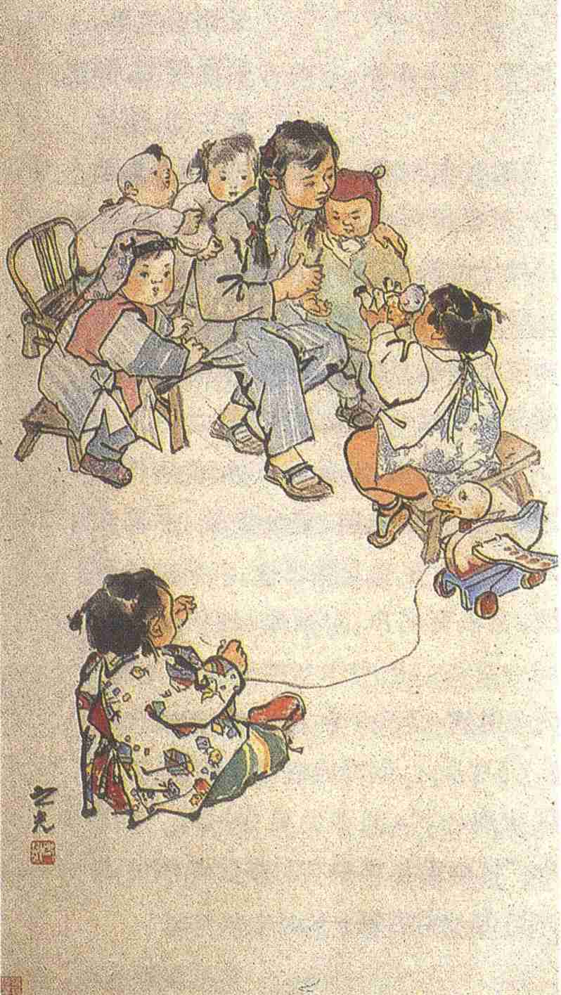此图作于1959年,画六个小孩、一位保育员,以中国画的传统布局,既无衬托,亦无背景。构图上注意聚散疏密,环绕保育员最近的有四个孩子,另一个坐在保育员正面而稍远,还有一孩坐于地,离保育员还要远一些。通过递布娃和外坐一孩牵引木鸭的动作,把小孩与保育员连贯起来,孩子们围绕着保育员颇使观赏者感到有节奏、有旋律的美。