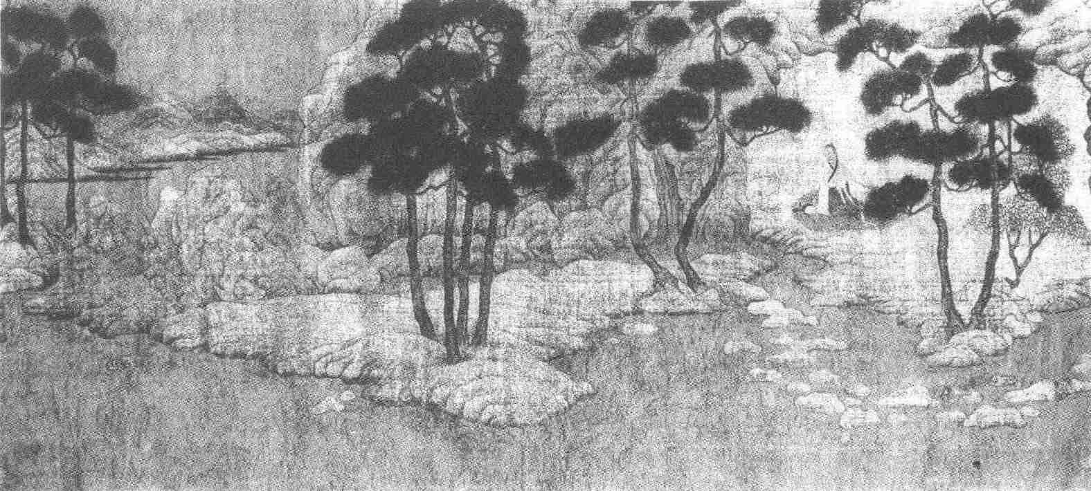 此图山麓绵亘,大石小石交织层叠,形成几个开合,占了全卷上半部分;左端山峰微露,而势直落,与几堆乱石会合;石外江水、远山,浩渺无际;山下溪水萦回,水面或宽或狭,中有一支细流穿过山脚与平坡,绕到那些碎石的背后而注入江中。以上这些占去全卷的下半部分。溪中碎石聚散,乍看似出无意,却隐约地运动着,盘成一条轴线,和山麓石层起伏之势相呼应,从而卷之上、下分而复合。溪边的坡、石上,有长松十余株,或直立,或倚斜,松叶茂密,和溪流相对,显得全卷上实而下虚;然而溪中碎石所含的轴线或动向,又使虚中有实,不嫌空洞,更有助于画面空间的和谐与统一。以上种种足以说明孟頫构图的真本领。尤其是细流曲折,长松丰茂,列于两岸,右岸复推出平坡,与山脚相接,中间一片空白,笔入虚无,而境益幽邃,就在这里一人侧面趺坐,双手抚席,衣带下垂,意态安闲,目光却随着细流的去向,可以望见那辽阔的江天——他便是谢幼舆了。如此惨淡经营,才把主人公安放在最为赏心悦目的画面空间,以再现顾恺之的创作意图:“宜置此子于丘壑中”,从而将观照、欣赏推到一个深层次了。