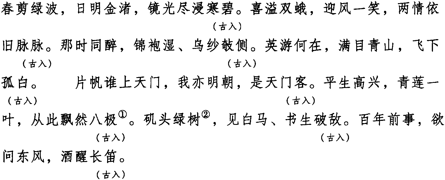 注:一、本词例押古入声“陌” “锡” “职”韵。因“陌” “锡” “职”在古韵中与“碧” “寂” “力” 同韵,而“碧” “寂” “力” 在现代韵中属“衣” 韵,故全调可押衣部“衣” 韵。