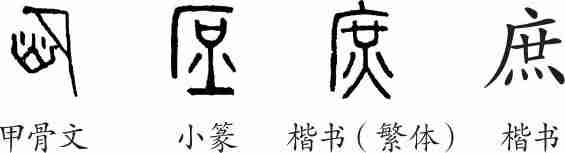 “庶”是会意字。甲骨文字形像在山崖避风处,用锅灶烧火蒸煮之形,应该是初民生活的写照。隶变后楷书写作“庶”。