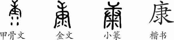 “康”是指事字。甲骨文从庚(摇铃),下边四点象征摇铃发出的乐声,表示正在演奏乐铃。隶变后楷书写作“康”。