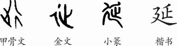 “延”是会意兼形声字。甲骨文和金文都从止(脚),从彳(道路),会走长路之意。小篆另加义符“厂”,表示拉长之意,厂兼表声。隶变后楷书写作“延”。
