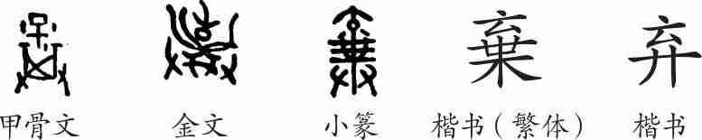 “弃”是会意字。甲骨文上部像一个头向上的婴孩(表逆产),三点表胎液;中间为簸箕;下部是两只手,会把不吉利的逆产儿丢掉之意。隶变后楷书写作“棄”,汉字简化后写作“弃”。
