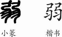 “弱”是象形字。小篆像两把弯曲的弓,彡像毛羽之形,两部分合起来表示柔弱。隶变后楷书写作“弱”。