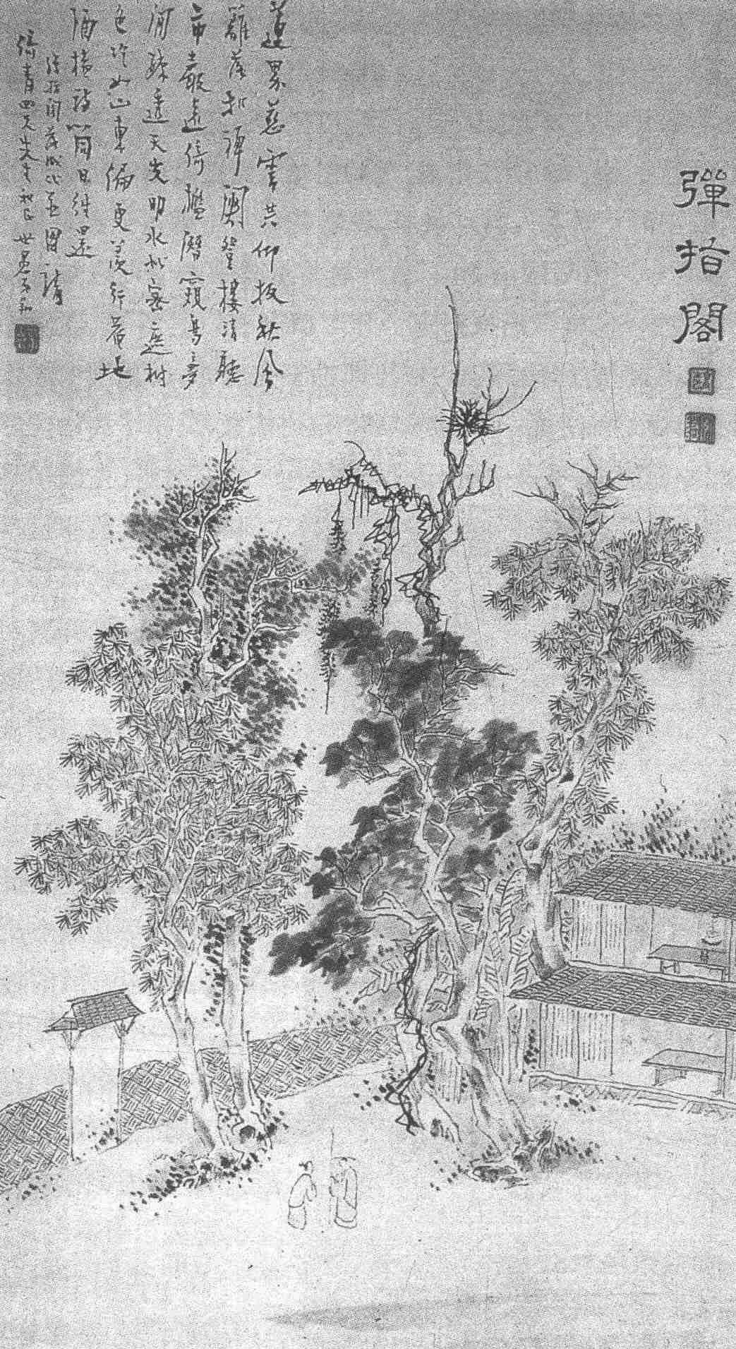 这是一幅写实的园林小景,址在今扬州天宁寺外的梅岭西园内。据李斗《扬州画舫录》卷四载:“枝上村,天宁寺西园下院也,在寺西偏,今归御花园。旧有晋树二株,门与寺齐,入门竹径逶迤,花瓦墙周围数十丈,中为大殿,旁建六方亭于两树间,名曰晋树亭,为徐葆光所书。南构弹指阁三楹,三间五架,制极规矩。阁中贮藏图书玩好,皆稀世珍。阁外竹树疏密相间,鹤二往来闲逸。阁后竹篱,篱外修竹参天,断绝人路。”文中描述与画面不尽相同,这是由于高翔画的是弹指阁落成之时,当时是天宁寺的下院。至乾隆二十三年(1758)于寺西建造行宫的时候,高翔已辞世六年了。李斗所写的正是清高宗乾隆南巡之后,弹指阁已是御花园的景象了,然而“幽静”、“深秀”之美始终保持着。