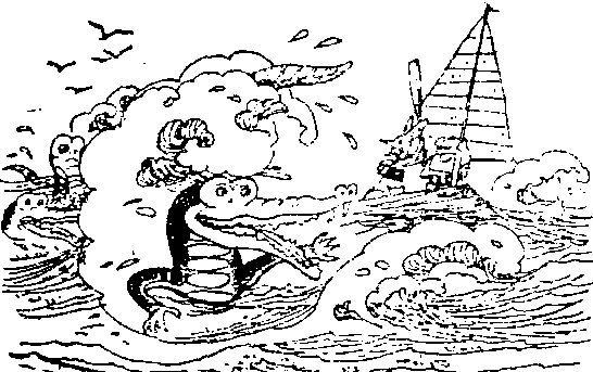 扔出去的毛裤立刻把鳄鱼的注意力吸引过去。它们疯狂地争抢着、撕咬着。等到毛裤的每一块小片都被吞下时,小木民和小长鼻已经漂下去好几哩了。