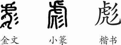 “彪”是会意字。金文像一只虎,其右的三道撇是虎背上的三道花纹。小篆已经看不出老虎的形状了。隶变后楷书写作“彪”。