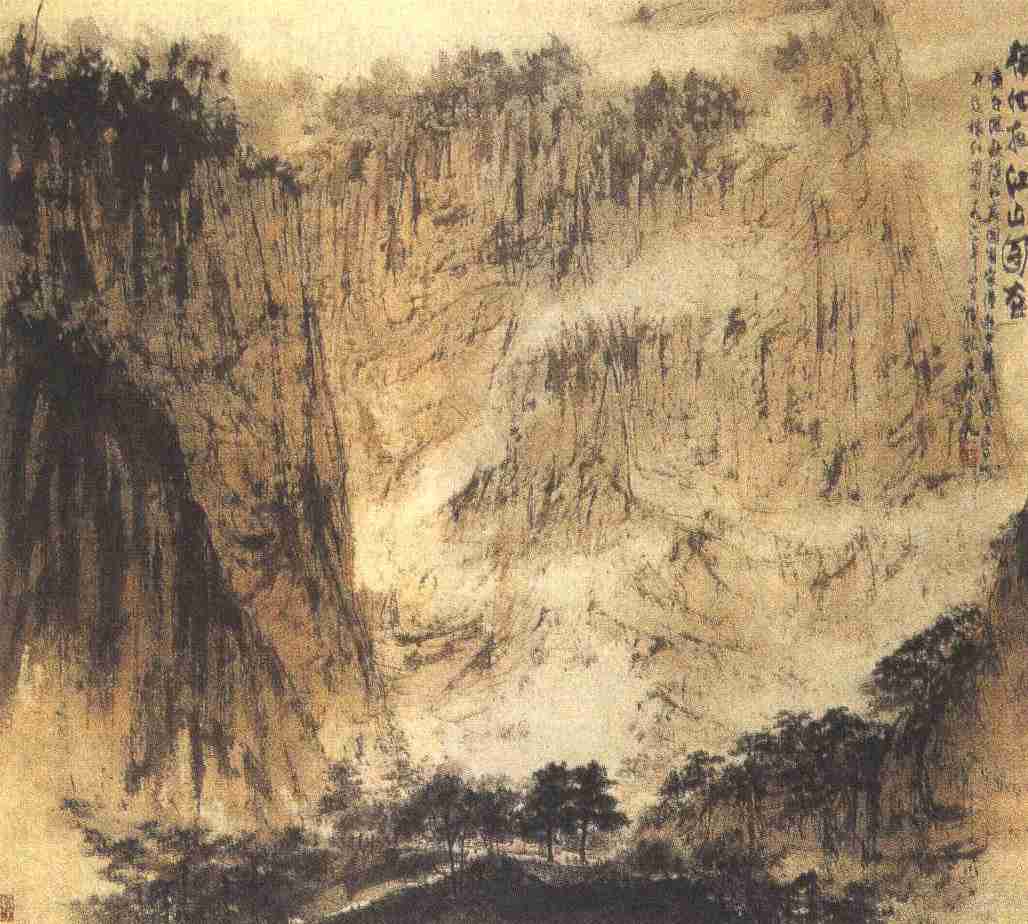 为了倾吐内心所感并与实景的形神相吻合,画家大胆抛弃了古人描绘华山常用的荷叶皴,也打破了中锋用笔和侧锋用笔,他将笔锋散开,糅合乱柴、披麻、卷云、荷叶等多种皴法,下笔如风驰电掣,曲折圆转,纵横交错,或拖长线,或扫飞白,随势铺衍,运生出丰富多姿的线条、斑驳长短的飞白和浓淡层次,淋漓痛快地再现出石纹的质感、云气的流动感。使画面疏密有致,虚实相生,变幻莫测,越显出气势雄壮,韵律丰富,具有强烈的艺术个性和时代气息。人们把他这种独创的皴法称为“抱石皴”。