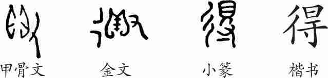“得”是会意字。甲骨文从貝从手,会得到、获得之意。金文加“彳”,会在路上拾到宝贝之意。小篆发生讹变。隶变后楷书写作“得”。