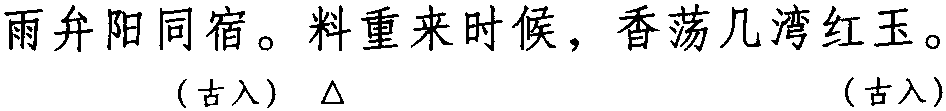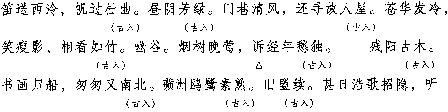 注:本词例押古入声“屋” “沃” “职”韵。因“屋” “沃” “职” 在古韵中与“绿” “禄” “副” 同韵,而“绿” “禄” “副” 在现代韵中属 “姑” 韵,故全调可押姑部“姑” 韵。
