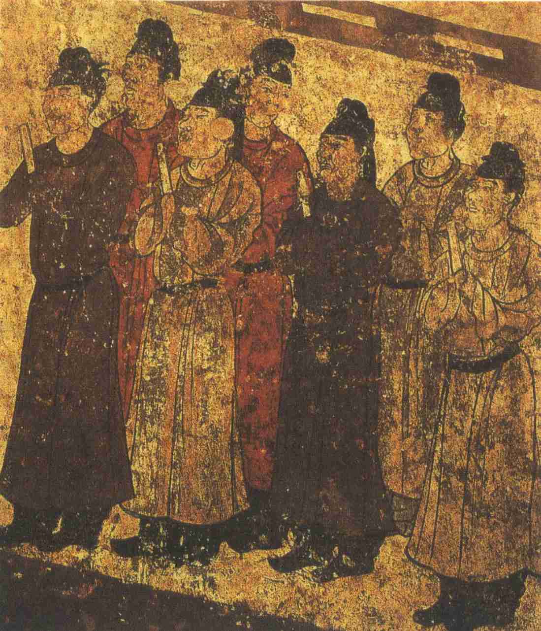 西壁南铺侍女亦七人一组,面部丰满圆润,体态清挺优美,多高髻或双髻,均着窄紧长袖,肩披彩帛,长裙曳地,下露云头履,手持瓶、杯、烛台、拂尘等各种物品,衣饰着色艳丽明爽,唯手、脸、衣服等多处因淤泥浸蚀剥落受损,不如上述第三过洞东、西壁男侍人物为完整。前面领头者四周布局稍见空松,随从略为密集,显其疏密之致,并有正侧面的变化,艺术水平不在永泰公主墓中的《女侍图》之下。