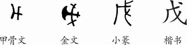 “戊”是象形字。甲骨文像一把长柄宽刃的大斧,刃部朝左,形似弯月。金文更像一把大斧之形。小篆已经看不出斧头的模样了。隶变后楷书写作“戊”。