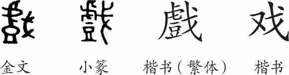 “戏”是会意兼形声字。金文从戈,会手持兵器,在鼓声中比武角力之意。隶变后楷书写作“戲”。汉字简化后写作“戏”。
