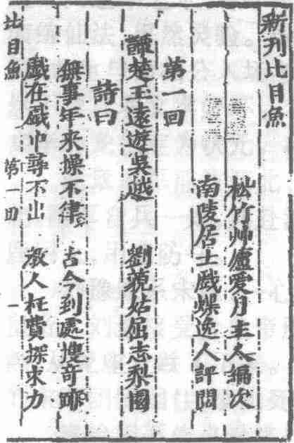 清代白话长篇世情小说。一名《比目鱼》。七回。题“松竹草庐爱月主人编次,南陵居士戏蝶逸人评阅”。两者均不详为何人。成书于清嘉庆年间。