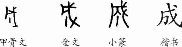 “成”本为会意字。甲骨文左下角像一块木状物,右边是一把长柄板斧,用以斧劈物会斩物为誓以定盟之意。金文大体相同。小篆讹变成从戊、丁声的形声字。隶变后楷书写作“成”。