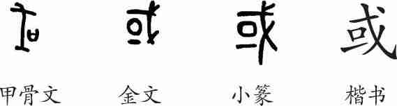 “或”是会意字。甲骨文从囗(城),从戈,会用武器守卫地域之意。金文线条化、复杂化。隶变后楷书写作“或”。