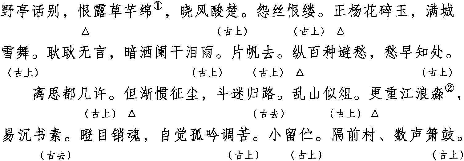注: 一、本词例押古上声“语” “麌” 韵,古去声 “遇” 韵。因 “语” “麌”“遇” 在现代韵中属“居” 韵,故全调可押衣部“居” 韵。
