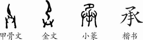 “承”是会意字。甲骨文像一个屈膝的人作授物之形,下有一双手做出接受的样子。金文大体相同。小篆下边又加了一只手。隶变后楷书写作“承”。