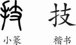 “技”是形声字。小篆从手,支声。隶变后楷书写作“技”。