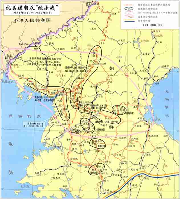 1951年夏,美军对朝鲜北方凭借空军优势,发动“空中封锁交通线战役”,对朝鲜北部交通枢纽和重要路段实施狂轰滥炸,企图摧毁北部的交通运输补给系统,瘫痪中朝军队后方,并把这种持续的战略性轰炸称为“绞杀战”。8月中旬至8月底。美军实行大规模轰炸,使大部分桥梁、铁路陷入瘫痪,1,200余千米的铁路线能够维持通车的仅存290千米。中朝军队遂调集高射炮兵保卫重点桥梁;中国人民志愿军铁道兵部队集中力量抢修被毁桥梁和线路;工兵部队和汽车运输部队在桥梁线路被破坏处一面抢修,同时进行漕渡或实施分段倒运,使各线路有机地连接起来,维持线路通车。经努力抢运到前线的作战物资达1,134个车皮。9至12月,美空军轰炸重点转移到铁路枢纽新安州、价川、西浦三角地区。美空军平均每天出动100余架次飞机,集中轰炸新安州至渔波、价川至顺川的铁路线,长仅73.5千米的几段线路上,4个月内共落弹38,186枚,平均每两米中弹一枚,80%的时间不能通车,给中国人民志愿军供应造成极大困难。志愿军迅即以歼击航空兵协同苏联军队航空兵集中在清川江地区上空,打击美空军,掩护地面部队抢修抢运,此间共出动飞机3,526架次;高射炮兵采取“集中兵力,重点保卫”的方针,以70%的兵力掩护三角地区的铁路运输;铁道兵部队集中兵力抢修;运输部队采取密集的“列车片面续行法”,突击抢运。4个月内,共抢运各类物资15,483个车皮。1952年1至6月,美军航空兵将袭击地域移向三角地区外围,重点轰炸新安州至宣川、价川至熙川、高原至文川间和新成川东西段的铁路。3月以后,美空军采取24小时昼夜不停地饱和轰炸。半年中,铁路破坏量较前两个阶段增加42%。志愿军航空兵协同苏军航空兵加强与美军航空兵的空战,保卫重点地区铁路安全;高射炮兵部队实行“重点保卫,高度机动”的方针,划分区域,保卫桥梁、车站等重点目标。志愿军经过积极斗争,采取各项措施,使重要铁路各线通车达68.9%至96%,公路运输能力提高70%。5月份即超额完成半年运输任务。这个阶段,志愿军航空兵出动飞机2,588架次,击落美机198架。
