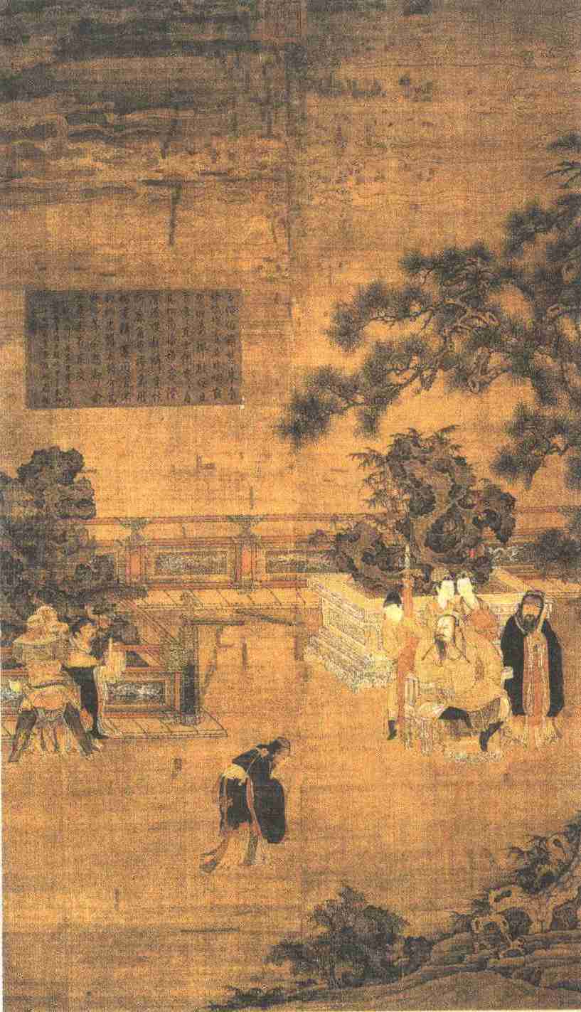 此图是历史画,描绘著名的西汉朱云折槛故事。画幅左边攀槛大呼、与力士争执的是主人公槐里令朱云,中间折腰下拜的是左将军辛庆忌,右面坐在椅子上的是怒气冲冲的汉成帝,旁边站着安昌侯张禹,还有两名宫女和一个太监。
