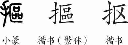 “抠”是形声字。小篆从手,區声。隶变楷书后写作“摳”。汉字简化后写作“抠”。