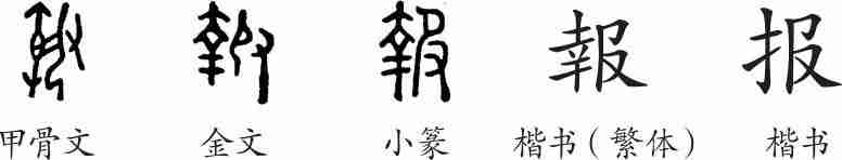 “报”是会意字。甲骨文和金文左边是一个刑具,右边是一只手抓住一个人给其加上刑具的样子,会给人治罪之意。小篆整齐化。隶变后楷书写作“報”。汉字简化后写作“报”。