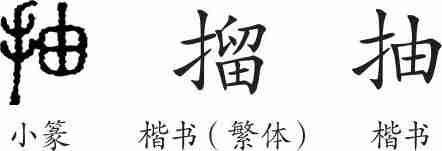 “抽”是形声字。小篆从手,由声;或从手,留声,写作“”。如今规范化,以“抽”为正体。