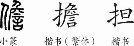 “担”是形声字。小篆从人,詹声。隶变后楷书写作“儋”和“擔”,改为从手。汉字简化后借“担”来表示,“儋”则另表他义。