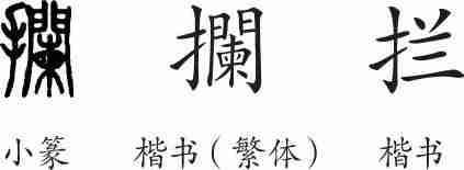 “拦”是形声字。楷书繁体写作“攔”,从才、从手从阑会意,阑兼表声。汉字简化后写作“拦”。