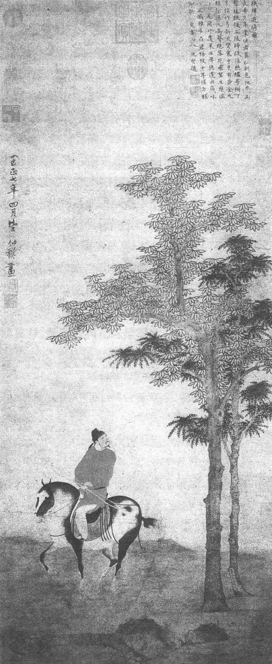 图上有元人逎贤小楷题诗:“《挟弹游骑图》:长安少年豪侠者,茜红衫色桃花马。击球纵猎五陵归,缓控丝缰芳树下。牙弰竹弓新月弯,囊中更有黄金丸。绿阴深沉鸟声绝,落花飞絮生愁端。君不见堕卵覆巢非厚德,蓬肉区区味何益。鹓雏多在碧梧枝,少年慎勿轻弹射。”其中道出为人以德为要,多发人深思之处,也有助于欣赏是图。作者署“至正七年四月望仲穆画”,得知此图为作者五十九岁成熟时期结构严谨、构思新巧、从唐人变出的精品。但和赵孟頫相比,其笔墨气局略显拘谨,不如其父画法谨严中见萧散、松灵、简率的情意,在气韵、形似兼备方面稍逊一筹。