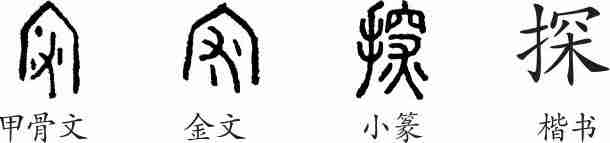 “探”本义是把手伸进去摸取。如成语“探囊取物”。引申为探测。如《商君书·禁使》:“探渊者知千仞之深。”又引申为发现、寻求。如“探本穷源”、“探口风”。