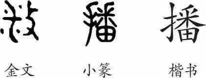 “播”是形声兼会意字。金文从攴,从釆(野兽足迹),会散乱之意。小篆改为从手,番声,番兼表散乱之意。隶变后楷书写作“播”。