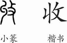 “收”是会意兼形声字。小篆从攴,从丩,会拘捕犯人之意,丩兼表声。隶变后楷书写作“收”。