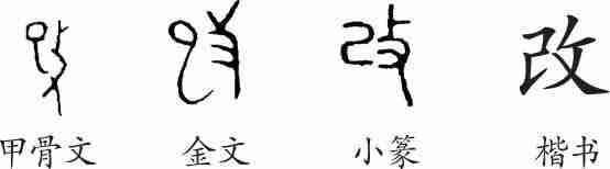 “改”是会意字。甲骨文像一个孩子一只手拿着小鞭子抽打之形。金文与甲骨文基本一样。小篆线条化。隶变后楷书写作“改”。