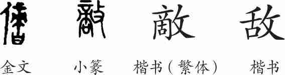 “敌”是形声兼会意字。金文从人,啻声。小篆改为从攴(手持杖),啻声。隶变后楷书写作“敵”。汉字简化后写作“敌”。