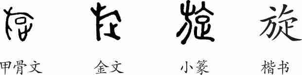 “旋”是会意字。甲骨文从疋(足),从(旗帜),会人随军旗的指挥而周旋之意。小篆整齐化。隶变后楷书写作“旋”。