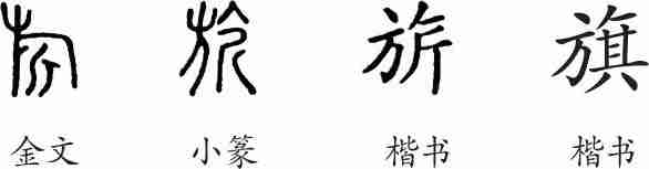 《说文·部》:“旗,熊旗五游,以象罚星,士卒以为期。从,其声。《周礼》曰:‘率都建旗。’”(旗,画有熊的旗帜有六根飘带,用来象征罚星。士卒把熊旗的竖立当做聚集的时间。从,其声。《周礼》说:“将帅和都主竖立熊旗。”)