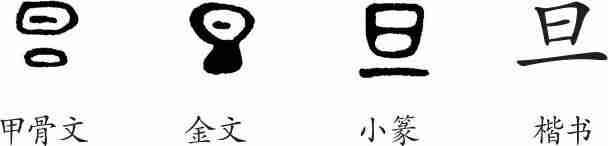 “旦”是会意字。甲骨文上为日,下为地平面。金文像太阳刚跃出海面,正与水相连。小篆下部变成了地平线。隶变后楷书写作“旦”。