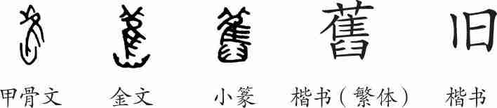 “旧”是象形字。甲骨文像头顶有毛角、瞪着两个大眼睛的猫头鹰之形;或另加“臼”表声。金文大体相同。小篆整齐化。隶变后楷书写作“舊”。汉字简化后写作“旧”。