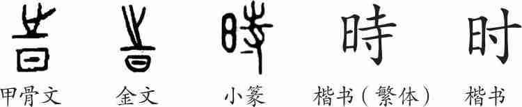 “时”是会意兼形声字。甲骨文、金文皆从日,从之(前往),会日月运行成四时之意,之兼表声。小篆变为从日,寺声。隶变后楷书写作“時”。汉字简化后写作“时”。