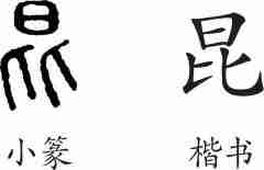 “昆”是会意字。小篆从日,从比,表示二人在日光下并肩行走,会太阳为天下人共享之意。隶变后楷书写作“昆”。