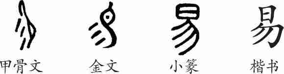 “易”是象形字。甲骨文像头朝上的一条蜥蜴。金文与甲骨文基本一样。小篆线条化。隶变后楷书写作“易”。