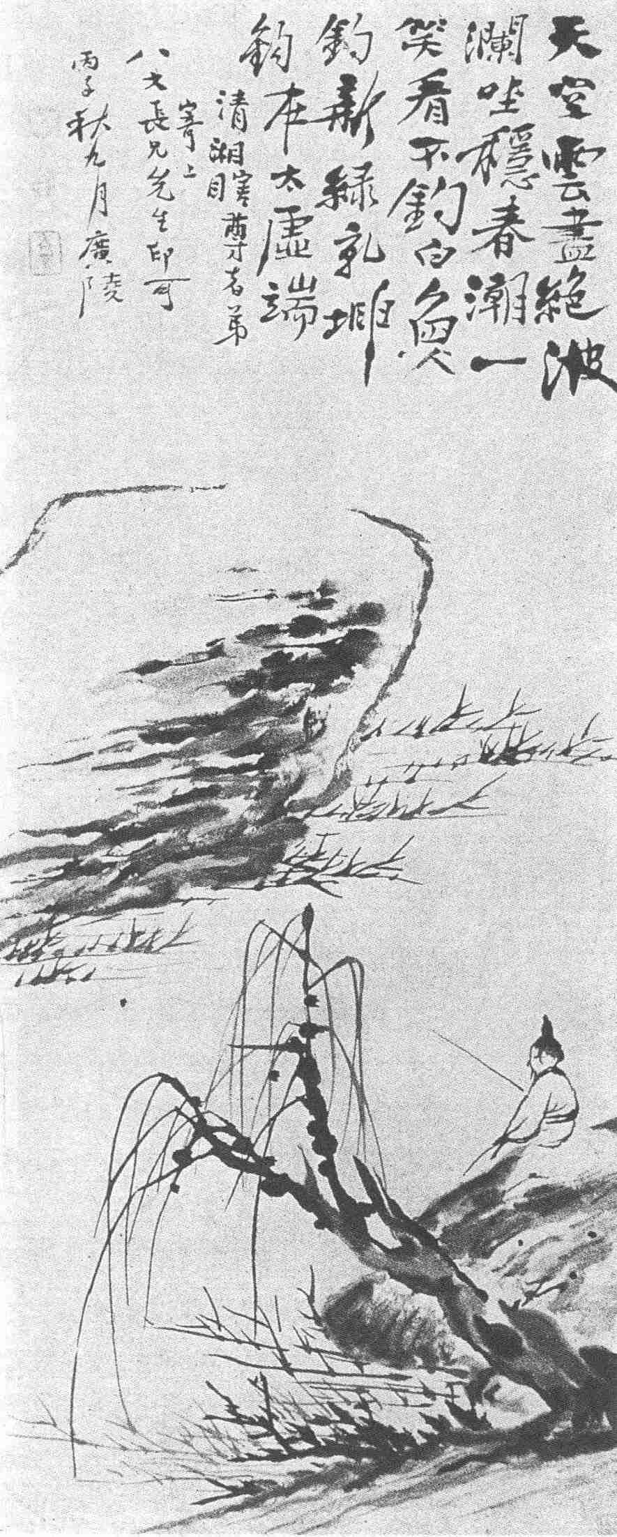 此图系石涛从扬州寄给八大山人的,是一幅经心刻意的杰作。图中一人,道家装束,发结在头顶正中,与他寻常画的发结在后脑部位的明代装束有所不同。又他画人物比较清癯,而这个人物很是丰满;据故宫博物院所藏八大画像和记载对证,八大是很魁梧的,或许石涛把他印象中的八大在画中点出了。八大作画爱用简笔,石涛也用了极简练、概括的笔调,刻画春波浩荡的景色。一株古柳,嫩枝新垂,直下几笔,腕力千钧,生机蓬勃。对面一块山石,正面横皴带点,是石涛拖泥带水法的独到本领,虽然着墨不多,而浓淡变幻层出不穷。山石轮廓主线,一波三折,妙在有节奏感,行笔从左到右,石顶一笔妙在大胆勾去,中间忽缺一段,意到笔不到,石顶左侧下倾一笔乃干笔侧锋下撇,益增虚实相生、淡烟迷笼的感觉。水面苇芽,笔笔腾踔,刚健婀娜,兼而有之。整个构图,以少胜多,意境超脱。加以陶熔了钟(繇)、颜(真卿)、苏(东坡)、黄(山谷)各家书法,成为自己一体的手笔,题上豪隽的诗句:“天空云尽绝波澜,坐稳春潮一笑看。不钓白鱼钓新绿,乾坤钩在太虚端。”这种诗和画的格调,开拓了后来扬州画派的诗画风气。