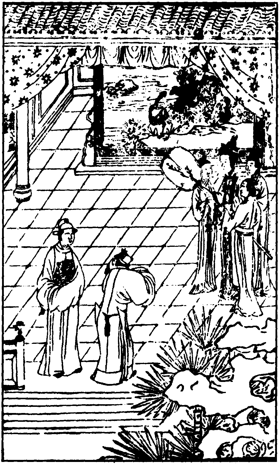 随后的 【北折桂令】 一曲系韦枢密对宇文彦的讯问之语,【江儿水】 则为宇文彦的答辞。【北折桂令】 中 “蜡楂” 同 “蜡渣”; “粉脸花腮” 是宇文彦发现误上枢密官船后为掩盖本来面目而在脸上涂抹胭脂花粉的结果; “足跣头科” 为赤足露顶之意。“漆身豫让”典出 《史记·刺客列传》,豫让是春秋战国间晋卿智伯的家臣,智伯为赵襄子等所灭,豫让用漆涂身,吞炭变哑,改换容貌,图谋刺杀赵襄子,为智伯复仇; “环柱荆轲”事见同书同传,战国末年燕太子丹遣荆轲行刺秦王嬴政,荆轲假作进献地图,趁机在秦廷下手,秦王环绕廷柱奔逃,荆轲紧跟在后追逐; 这里韦枢密断定宇文彦涂面改装意存不良,故借智伯和荆轲事来讽刺他。“隋何” 又作随何,为汉高祖刘邦的谋士,以能言善辩著称,所谓 “舌上隋何” 即指此而言; “萧何” 是汉代开国功臣,曾更定律法,故曲中云 “律上萧何”。“花押” 系文书末尾的草书签名或代替签名的一种特殊标志; “所在衙门” 指官船停泊之处的当地衙门。【江儿水】 中 “夜月悬梁惯” 和 “邻灯凿壁多”分别为汉代孙敬和匡衡之事,孙敬勤学不辍,夜中读书疲倦欲睡时,便取绳一端系发,一端悬诸屋梁; 匡衡家贫而好学,晚间勤奋。“钻穴逾墙” 语出 《孟子·滕文公章句下》的 “不待父母之命,媒妁之言,钻穴隙相窥,逾墙相从,则父母国人皆贱之”,意指男女私情为世所不齿,这里借此语为入室行窃的代称,“自不曾钻穴逾墙过” 即是说为人正派,从不行作奸犯科之事。“闯入天台” 系借刘义庆 《幽明录》 所记刘晨、阮肇入天台山采药的故典来喻指宇文彦上错船一事。韦枢密见宇文彦赤脚露头,一副惊慌失措之态,蜡黄的脸上还抹着一层脂粉,认定他是有意化装上船,准备下手行窃,遂令他从实招供,以便发文书送往当地衙门处理。韦枢密威胁说王法无情,再怎么饶舌都是不起作用的,只有老实坦白才有出路。宇文彦辩白说,自己是成都府学秀才,向来只知勤苦攻书,从未作过偷摸之事。为不损及父母脸面,宇文彦故意托名为于俊,不说随父上任途经当地,而声称是从蜀中游学到此,因酒醉误上官船,希望韦枢密手下留情,免罪释放。这里韦枢密的趾高气扬、自以为是和宇文彦的低声下气、饰词以辩相映成趣,给全出笼罩上一层浓厚的喜剧色彩。
