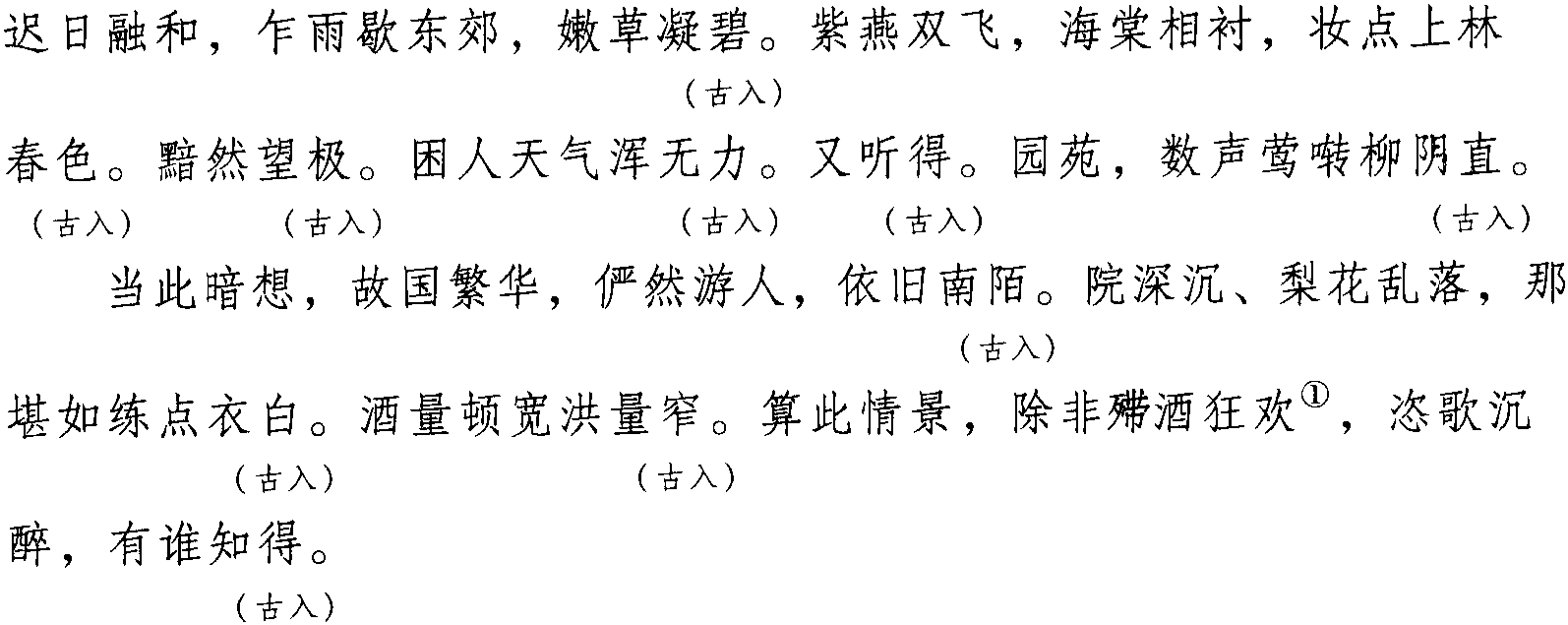注:一、本词例押古入声“陌” “职”韵。因“陌” “职” 在古韵中与“碧”“力” 同韵,而“碧” “力”在现代韵中属“衣”韵。故全调可押衣部“衣”韵。