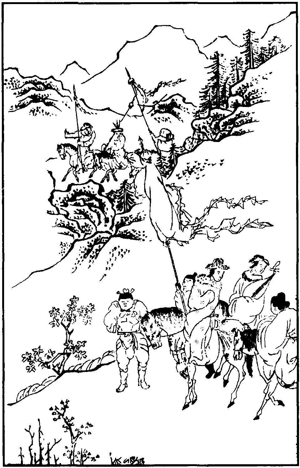 【北雁儿落带得胜令】 (旦)宫人,那里是哭虞姬别了楚霸王,端的是送娇娃替了山西将。保亲的像李左车,送女的一似萧丞相。止不过汉戟凛胡霜,则待出红儿扰白狼。压翻他杀气三千丈,那里管啼痕一万行。(贴)娘娘,你怨着官家,可想着宫中来么?(旦) 苍黄,今日个盼宫中,忘鞍上。参商,来日个望天山,疑帝乡。望天山,疑帝乡。