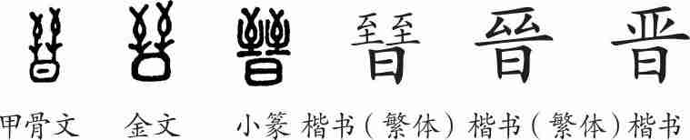 《说文·日部》:“,进也。日出万物进。从日,从臸。《易》曰:‘明出地上,晋。’”(,长进。太阳出来,万物前进滋长。由日、由臸会意。《易经》说:“明亮的太阳从地上出来,(万物)长进。”)